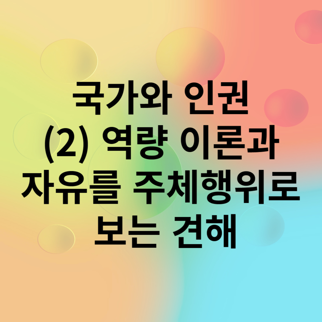 만일 인권이 모든 사람에게 보장되어야 하는 것이라면, 그 사람의 권리를 행사하는데 제한을 가하는 다른 억압 요인들을 무시한다는 것은 말이 되지 않습니다. 자유를 가로막는 억압 요인들은 국가의 폭압이나 불관용으로부터 비롯되기도 하지만, 그것만큼이나 빈곤, 질병, 낮은 교육 등으로부터 비롯되기 때문입니다. 그렇기 때문에 자유란, 간섭의 부재가 아니라 주체 행위 또는 진정한 선택을 할 수 있는 능력이라고 할 수 있습니다. 자신이 뜻하는 바를 달성할 수 있는 능력이 자유의 본질적인 요소가 되는 것인데, 이것을 보다 더 확장하면 개인들의 역량을 증진하기 위해서는 국가가 적극적인 행동을 취하는 것이 필요하다는 결론에 이르게 됩니다.