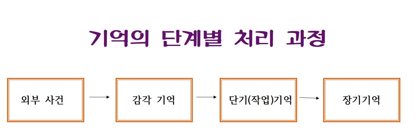 그림 <기억의 단계별 처리과정>을 보면, 주어진 환경에서 감각자극의 정보가 감각기억으로 유입되고, 이러한 정보 중 일부가 단기기억으로, 일부가 장기기억으로 전이되는 것을 알 수 있습니다.