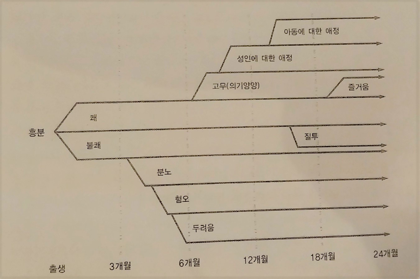 브리지스(Bridges, 1930)에 의하면 [그림 8-2]에서와 같이 신생아는 한 종류의 감정, 즉 일반적 흥분상태만을 가지고 태어납니다. 이 일반적 흥분상태는 약 3개월 무렵에 불쾌와 조금 뒤에 쾌로 분화됩니다. 6개월경에는 불쾌가 분노, 혐오, 그리고 두려움으로 나뉘며, 쾌는 고무와 애정으로 나뉩니다.
