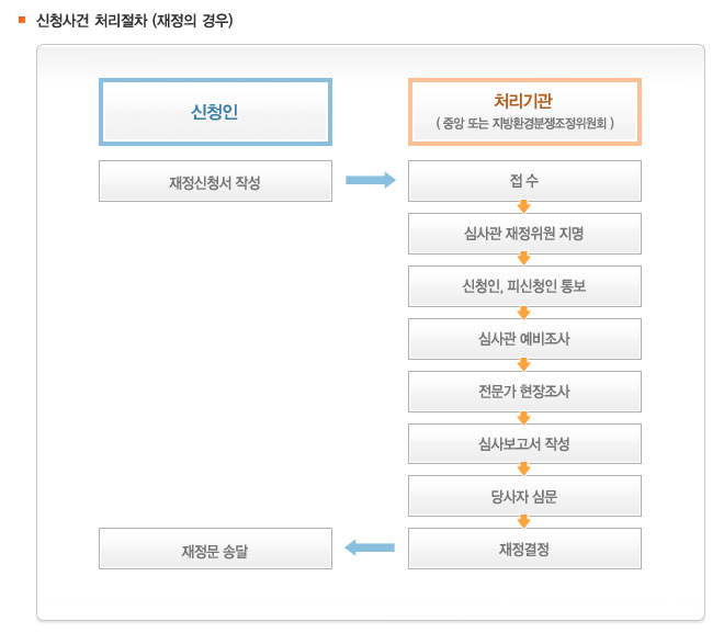 또한 중앙환경분쟁조정위원회는 직권으로 조정절차를 개시할 수 도 있습니다. ‘직권조정’ (환경분쟁조정법 제30조)이란 환경오염으로 인한 사람의 생명 신체에 대하여 중대한 피해, 환경 시설의 설치 또는 관리와 관련된 다툼 등 사회적 파급효과가 클 것으로 우려되는 환경분쟁에 대하여 당사자의 신청이 없어도 직권으로 조정절차를 개시하는 제도로 환경