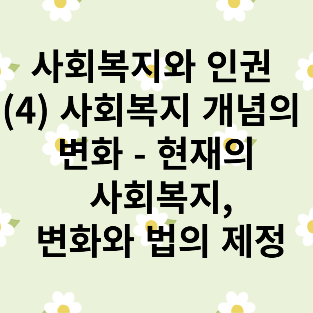 사회복지 개념의 변화는 법의 제정과 그 맥을 같이 합니다. 사회복지 개념이 변화하게 되면서 헌법이 보장하는 권리의 개념을 적극적으로 구현하려는 노력이 실제로 제도화되는 행정으로 나타나게 되는 것입니다. 또한 사회복지는 보완적 개념에서 제도적인 개념으로 전화되고 있음을 알 수 있습니다. 자선과 박애의 개념이었던 사회복지가 동등한 자격을 가진