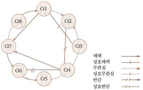 · 실선은 호감을 갖는 관계, 점선은 무관심한 관계, 끊어진 선은 불편한 관계를 의미함