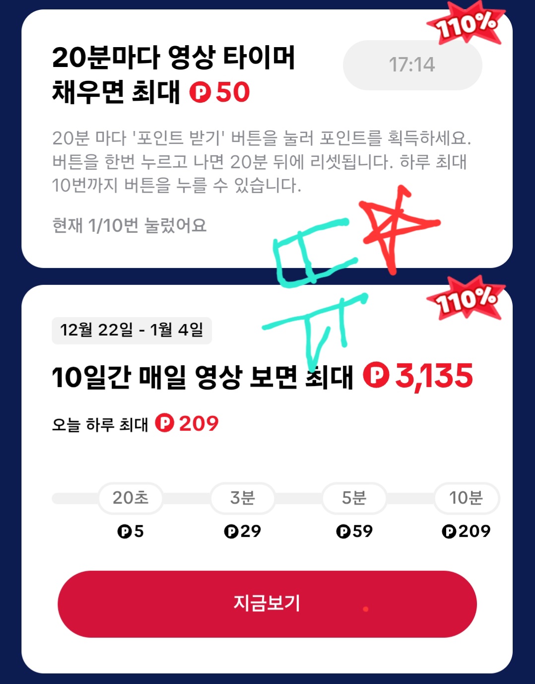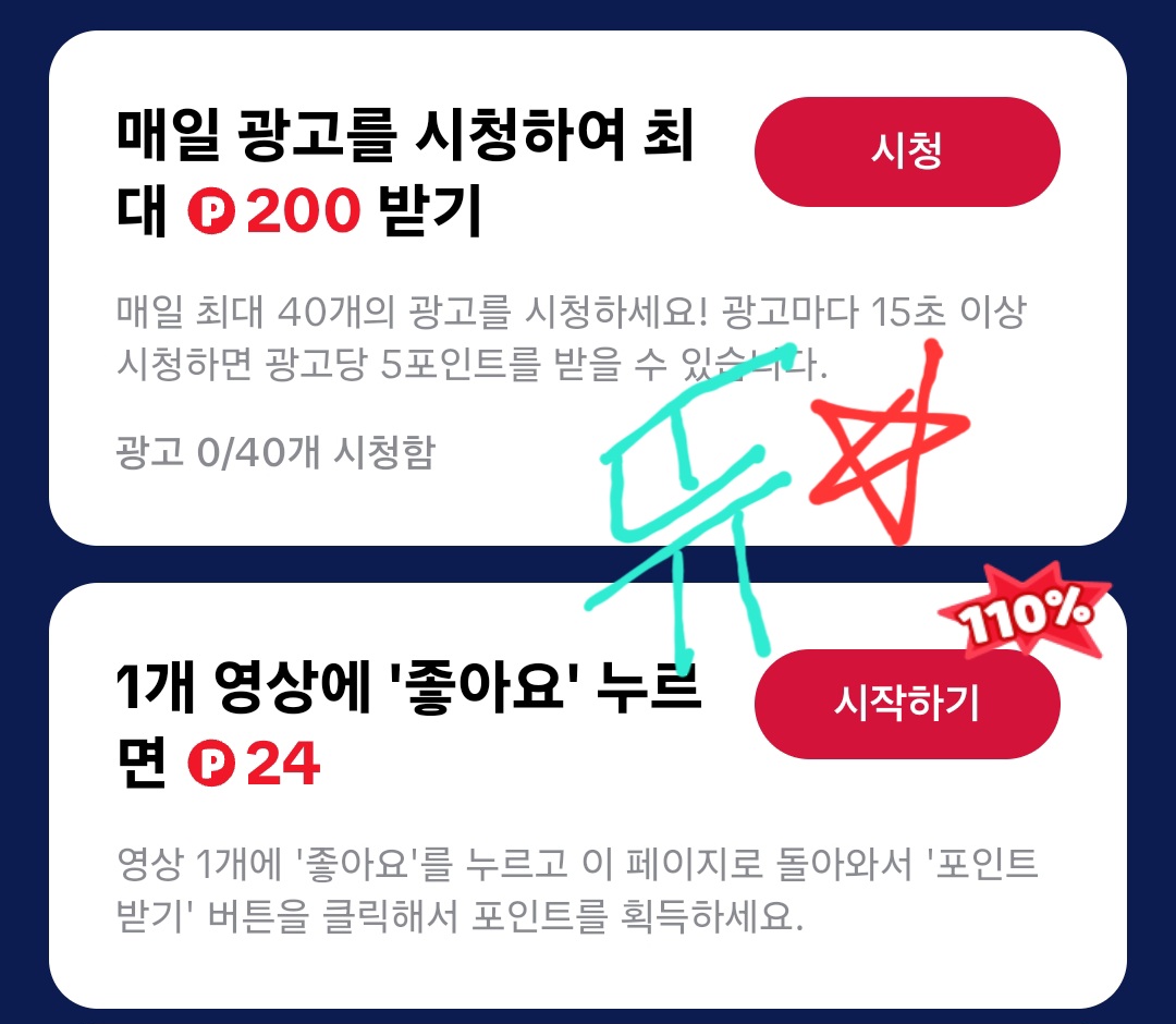 이렇게 영상보기 좋아요 누르기 같은 작은 미션들을 하게 되면 포인트가 소소하게 모이네요. 저 처럼 신규가입이 안되는 사람은 저런걸로 몇일동안 4600원을 벌었습니다. ㅋ