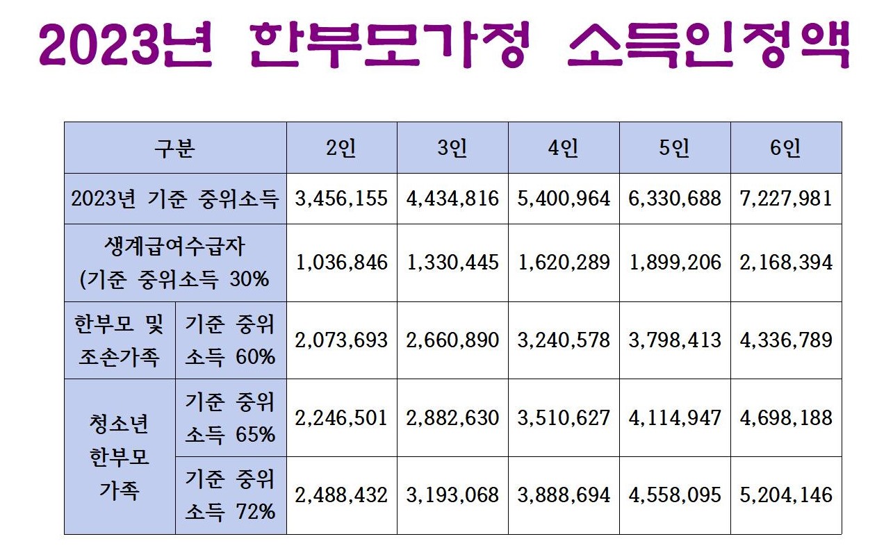 2023년 최신 기준의 한부모가족지원법 지워대상 가구 소득인정액 기준 참고표 입니다.