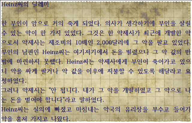 • Heinz가 아내를 살리고 싶어 하는 것은 당연하다. 그렇다고 해도 훔치는 것은 잘못된것이다.