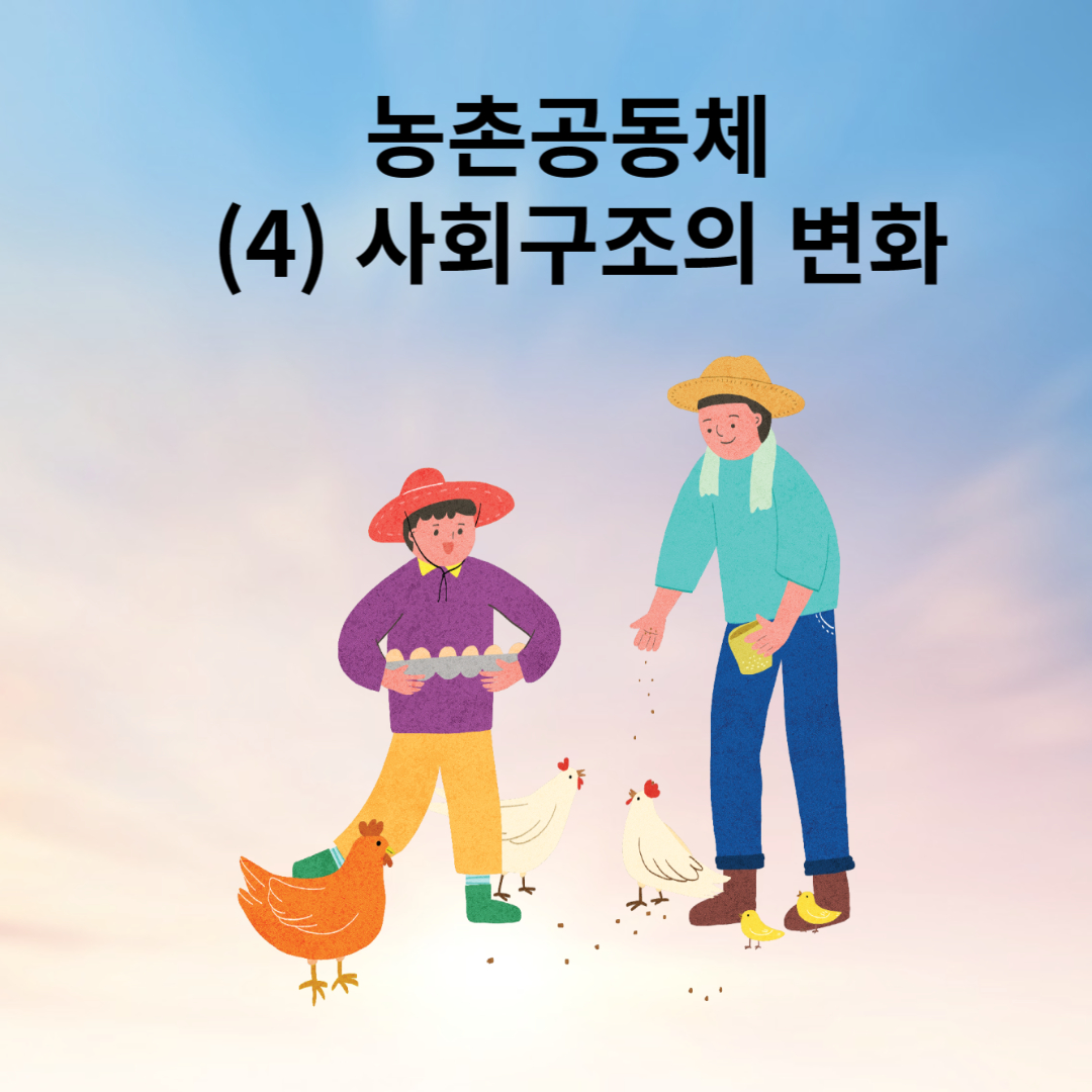 대부분의 농촌공동체에서 획기적인 사회구조의 변화는 신분제도의 붕괴와 더불어 시작했습니다. 과거의 신분제도는 단순히 지위의 서열만을 규정한 것이 아니라 공동체생활의 거의 모든 중요한 국면들을 규제합니다. 한국의 경우, 반상의 신분제도는 갑오개혁으로 무너져 신분에 의한 사회적 구속은 없어진지 오래되었으나 차별의식은 아직도 잔존하고 있습니다. 특히 양반성씨의 촌로들은 상민출신과 상민촌을 구별하는 습성이 여전히 남아 있습니다. 반상을 성씨로 구별하는 신분의식은 양반출신은 물론 상민출신까지도 혈연유대를 강화시켰는데, 그러나 신분제도 없이 혈연유대는 동족촌과 친족범위 이상으로 확대되기 어렵고 이것조차도 약화되는 경향이 있습니다. 신분제도의 폐기와 더불어 토지사유제가 채택되면서 과거의 반상의 신분관계는 지주와 소작의 계약관계로 전환되었습니다. 이러한 소작제도를 철폐하기 위하여 1948년 농지개혁을 시행하였는데, 이후 6.25 동란으로 그 실 효과를 완전히 달성하지 못했습니다. 그러나 대부분의 소작농은 영세자영농으로 전환되었습니다. 아직은 많은 소작농이 있으나 그들의 지주와의 관계는 계약관계이지 과거처럼 전인격적으로 구속된 관계는 아닙니다. 최근 한국의 농촌에서 가장 획기적인 제도적 변화는 농업협동조합의 소개입니다. 이는 민속사회의 협동적 유대에 기초한 ‘계’와 같은 전통적 금융제도가 보다 합리적이고 효율적인 제도로의 전환을 의미합니다. 농업협동조합의 운영에는 아직도 어려움이 있으나 농민들의 농협의존도는 계속 높아져 가고 있습니다.