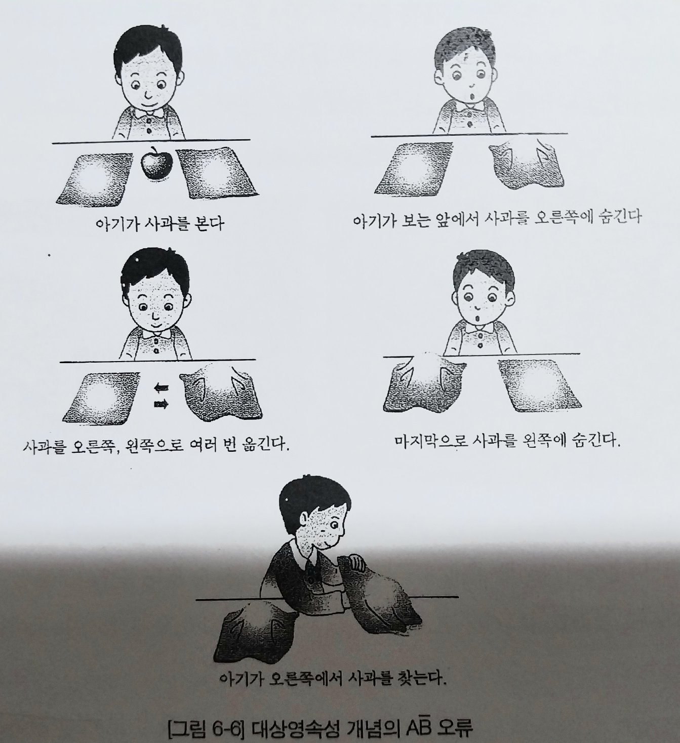 피아제는 이러한 대상영속성 개념이 영아기에 어떻게 형성되는가를 자신의 자녀를 관찰해 다음과 같이 기록하고 있습니다.
