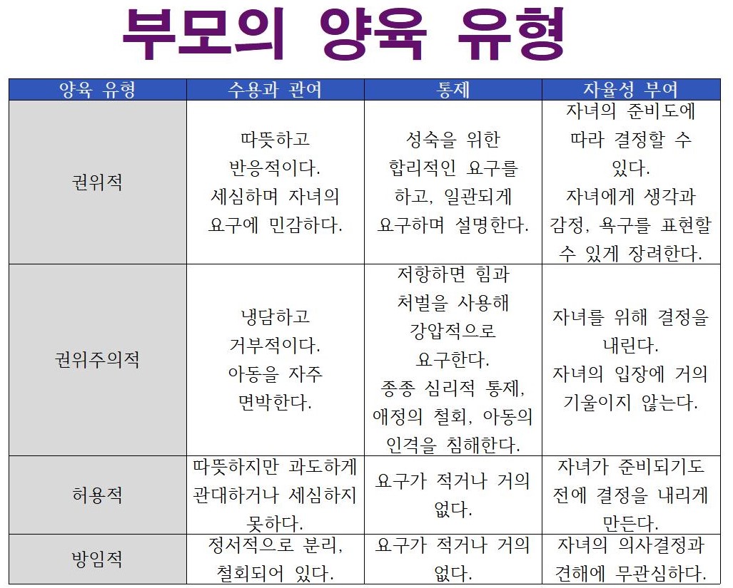 '첫째, 부모가자녀에게 수용과 관여하는가, 둘째, 통제하는가. 셋째, 자율성 부여를 하는가' (Gray&steinberg, 1999; Hart, Newell&Olsen, 2003), 이러 한 점이 양육 유형을 달리하고 있습니다.