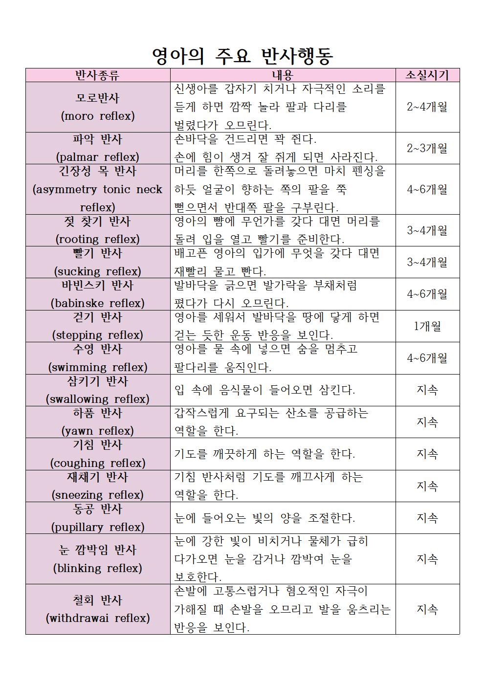 출생 시에 대부분의 영아의 행동은 반사행동이며 선천적으로 가지고 태어납니다. 반사행동은 비자발적인 운동이며 생후 4개월 이후에 소멸되며, 자의적인 행동으로 통합됩니다.