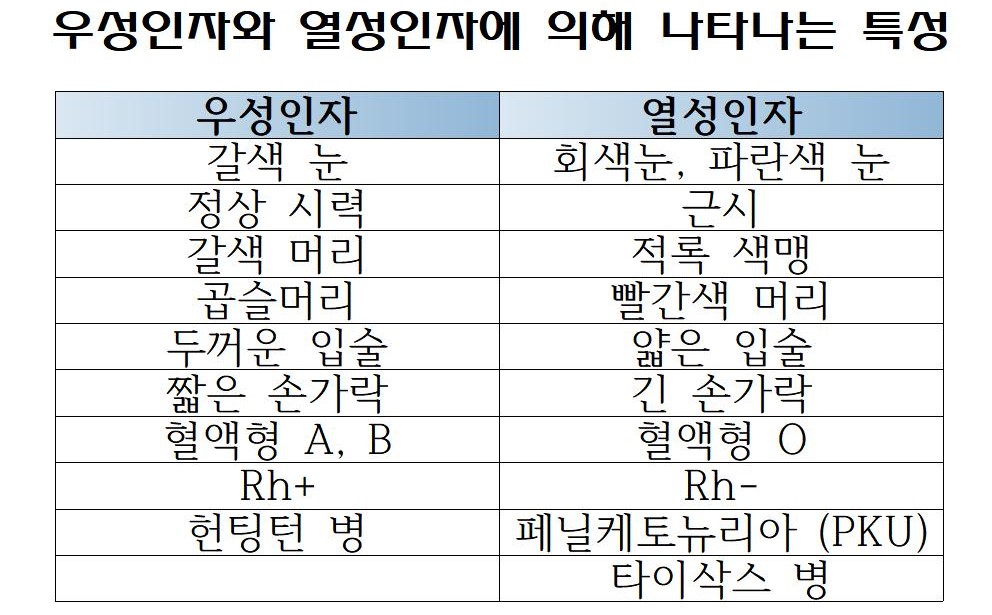 러나 열성 유전인자는 반드시 쌍으로 이루어져야만 그 특성이 나타날 수 있습니다. 우리가 갖는 여러 특성 중에서 우성인자와 열성인자에 의해 결정되는 것은 아래 표와 같습니다.