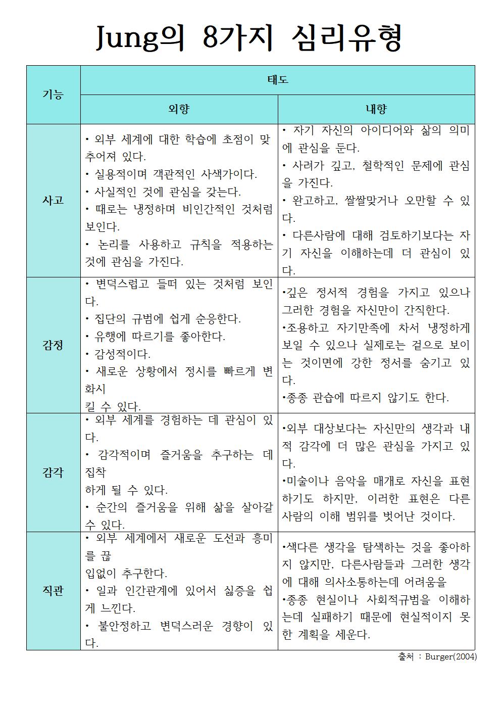 Jung은 성격의 개인차에 관심을 가지면서 내향(introversion) - 외향(extroversion), 사고(thinking) - 감성(feeling), 감각(sensing) - 직관(intuition)에 기초하여 심리유형을 설명하였습니다.