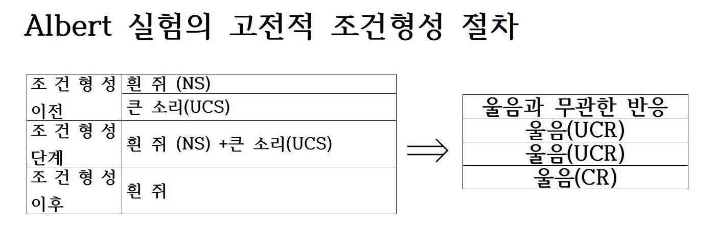 Watson은 환경이 인간발달을 결정하는 주된 요인이라는 개념을 발전시키기 위해 고전적 조건형성의 질차를 이용하였습니다. 그는 Albert라는 이름의 11개월 된 아기를 대상으로 실험하였습니다. 아기는 처음에는 흰쥐에 대해 전혀 두려움이 없었습니다. 오히려 선호하는 반응을 보였습니다. 그러나 아기가 흰쥐에 대한 선호 반응을 보이기에 앞서 큰 소리를 들려주자 아기는 처음에는 큰 소리로 인해 울음을 터뜨렸지만, 같은 시행을 여러 차례 반복한 끝에 아기는 흰쥐를 보고서도 놀음을 터뜨리게 되었습니다.